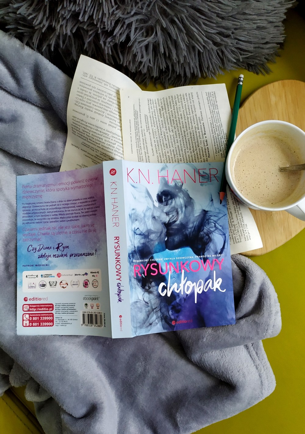 Muszę też przyznać, że czytając tę książkę, nie miałam wrażenia, że czytam polskiego Autora. Mimo że w ostatnich latach poziom literatury w Polsce znacznie się poprawił i książki, które recenzuję w końcu mają jakiś pomysł na siebie… To jednak ciągle widać różnicę między tymi zagranicznymi pozycjami, a rodzimą literaturą. Dlatego tym bardziej się cieszę, że miałam okazję przeczytać i to przedpremierowo „Rysunkowego chłopaka”. Dziś trzymając tę książkę w ręku, dam ją pewnie na półkę obok Penelope Ward i Colleen Hoover, chociaż w przeciwieństwie do obu Autorek, K.N. Haner w tej powieści jest bardzo grzeczna.