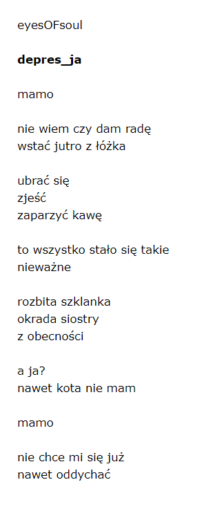 Ta książka nie jest jednoznaczna. Historia Diany trzyma w napięciu. A kiedy już człowiek myśli, że wszystko zostało rozwiązane i wyjaśnione, Autorka wbija w fotel. I to właśnie takie powieści dają nadzieję, że polska literatura idzie naprzód. Że jest na co czekać. I że są Autorzy, którzy potrafią mocno zaskoczyć. K.N. Haner pokazuje trudne oblicze śmierci. Mówi, że nie jest łatwo pogodzić się ze śmiercią bliskiej osoby, w szczególności jeśli jest to brat bliźniak. Nie jest też łatwo odgrodzić się od tego bólu. Napisałam niedawno wiersz o depresji i mam nadzieję, że nie pogniewacie się, że go tu wstawię. Uważam, że depresja dotyka coraz to młodszych osób. I niekiedy takie osoby żyją obok nas… I ich nie zauważamy. A czasem wystarczy tylko kogoś dostrzec, z kimś porozmawiać, by ten człowiek mógł znaleźć światełko w tunelu.